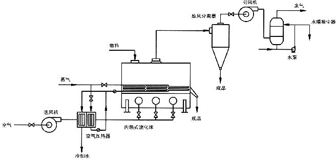 ◆ 内热式流化床干燥机是我厂与四川大学化工学院共同研创开发的断一代高效节能干燥装置。该装置主要由内热式流化床、送风机、引风机、空气预热器、旋风分离器和水膜除尘器等设备组成。环境空气经送风机吹入预热器进行预热,热空气流入流化床,气固两相在流化状态下进行接触,传热传质,完成对固体湿物料的干燥加工。湿物料通过加料机连续加入流化床,干燥产品从卸料口连续排出。废气经旋风分离器和水膜除尘器净化后,由引风机排出放空。它将内加热构件埋置在流化料层中,物料脱水所需热量分别由内加热构件和流化用热空气提供。广泛适用于精制盐、纯碱、过碳酸钠、芒硝、氯化钾、硝酸钾、氯化铵等等物料的干燥和冷却。